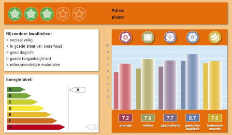 De duurzaamheidsprestaties die u na de gegevensinvoer te zien krijgt, zijn overzichtelijk ingedeeld in de vijf thema’s: energie, milieu, gezondheid, gebruikskwaliteit en toekomstwaarde. Per thema verschijnt een waardering op een schaal van 1 tot 10.